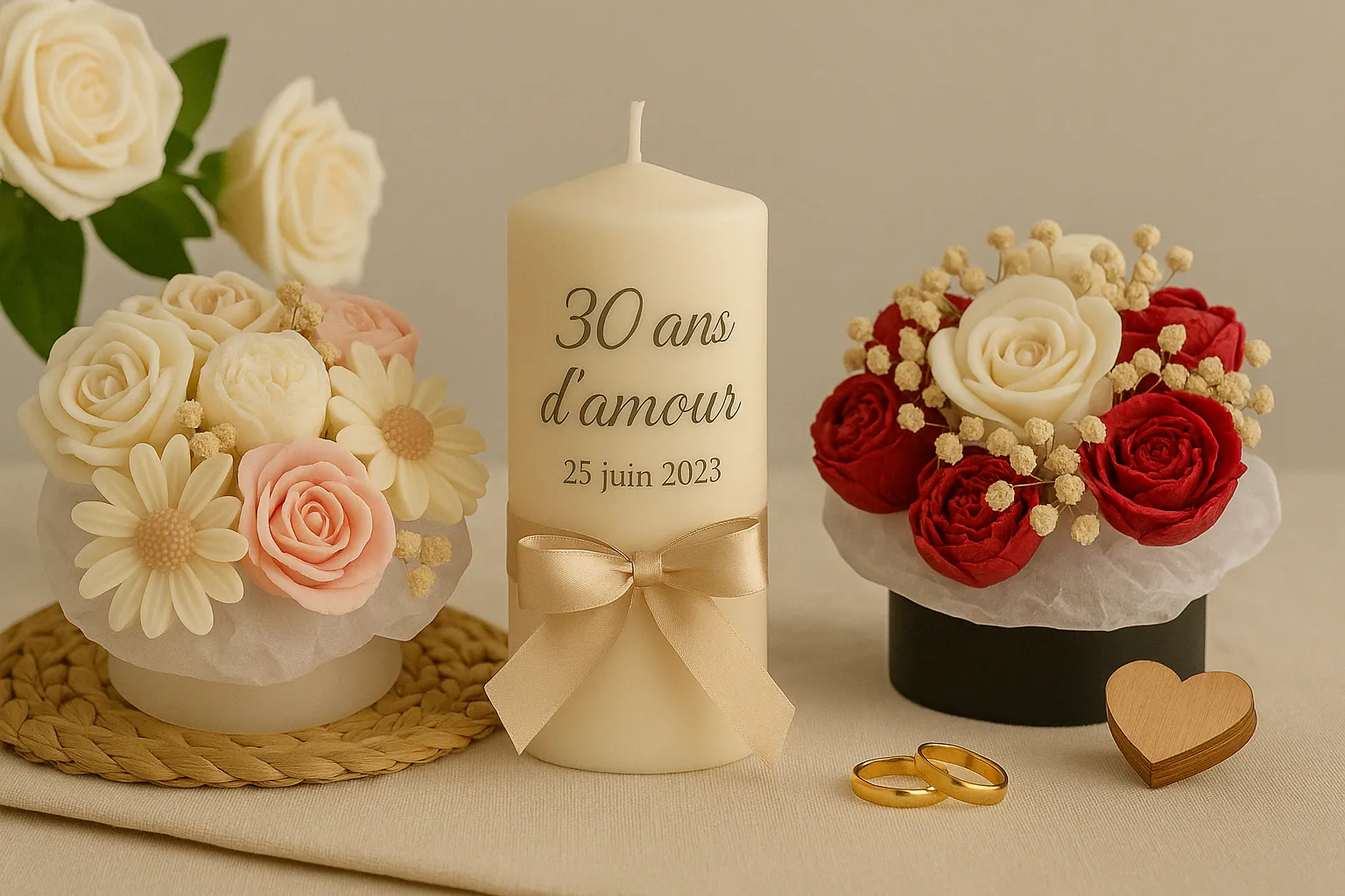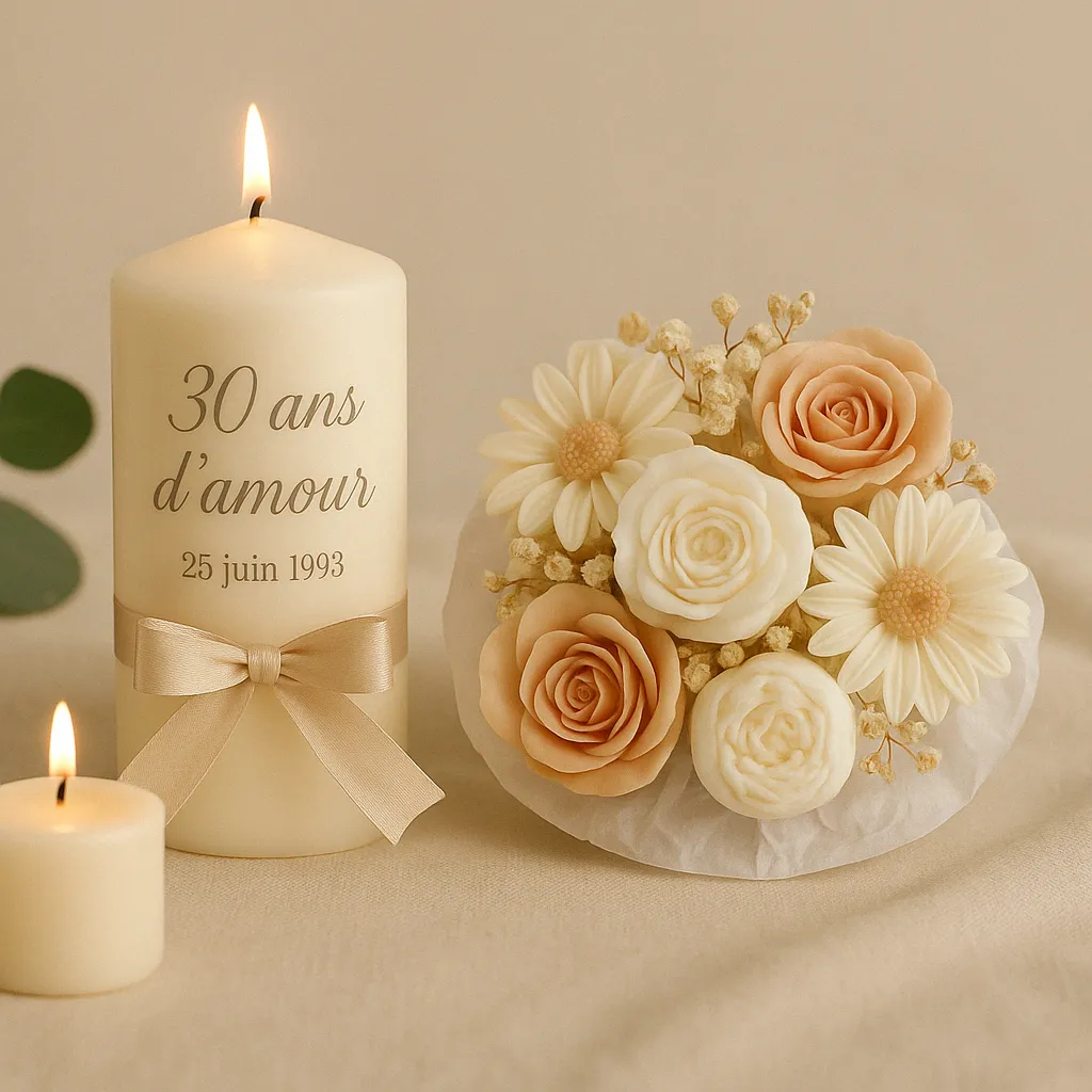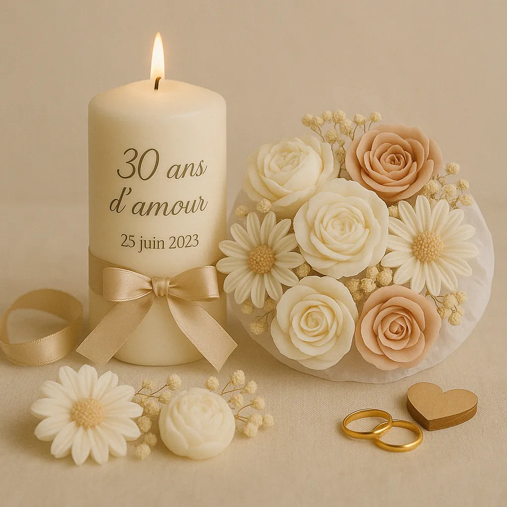 À la recherche d’une idée cadeau pour un couple ou pour votre moitié ? Les bougies anniversaire de mariage sont une option élégante, originale et pleine de symbolique. Que ce soit un bouquet de bougies fleuries, une bougie sculptée en forme de cœur, ou un coffret parfumé, chaque création artisanale évoque l’amour, la tendresse et l’engagement. Offrez un objet fait main, durable et raffiné, qui accompagnera les souvenirs du couple année après année.