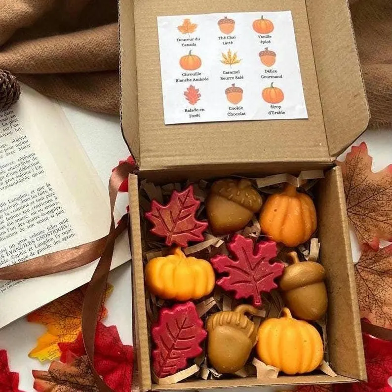 Craquez pour notre coffret de fondants parfumés aux senteurs d’automne : citrouille épicée, pomme caramélisée, feuilles d’érable… Des fondants artisanaux aux formes saisonnières à faire fondre dans un brûle-parfum pour créer une ambiance réconfortante et chaleureuse.