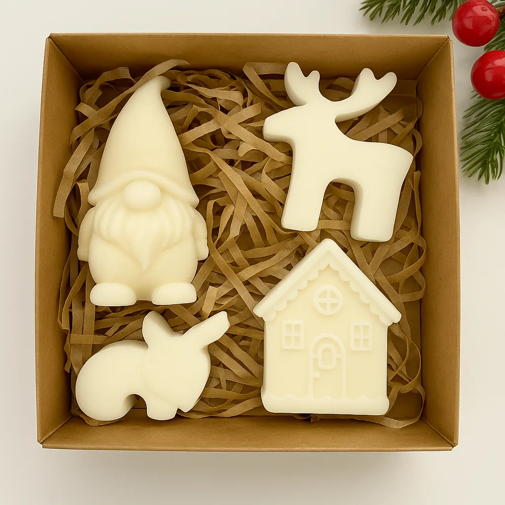 Plongez dans la magie de Noël avec notre coffret de bougies festif, composé de trois bougies artisanales en forme de Gnome, Renne et Maison. Un trio charmant et parfumé, idéal pour illuminer votre décoration de fêtes ou pour offrir un cadeau plein de douceur hivernale.