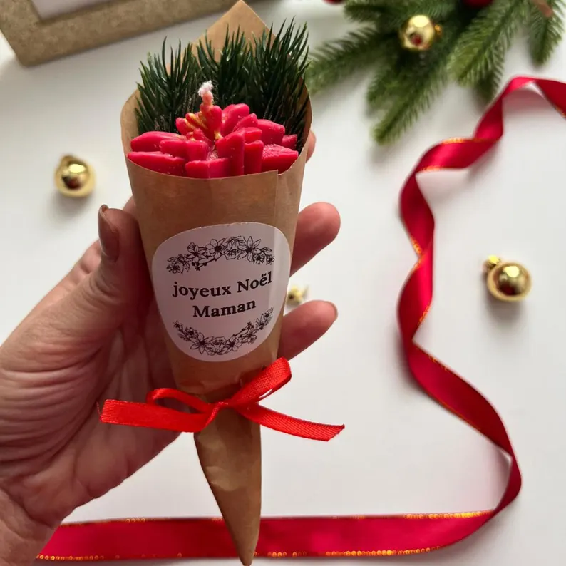 Offrez un cadeau de Noël unique et artisanal avec notre bouquet de bougies personnalisées composé d’une fleur de Noël rouge scintillante.