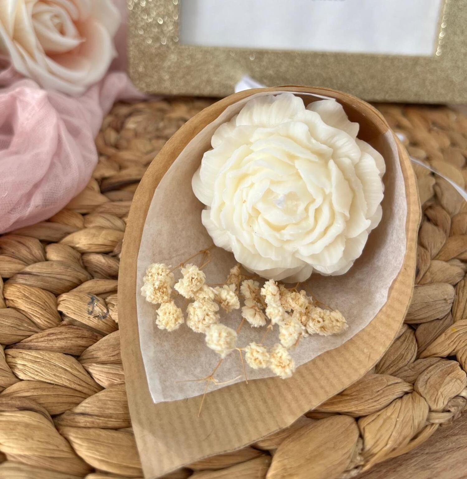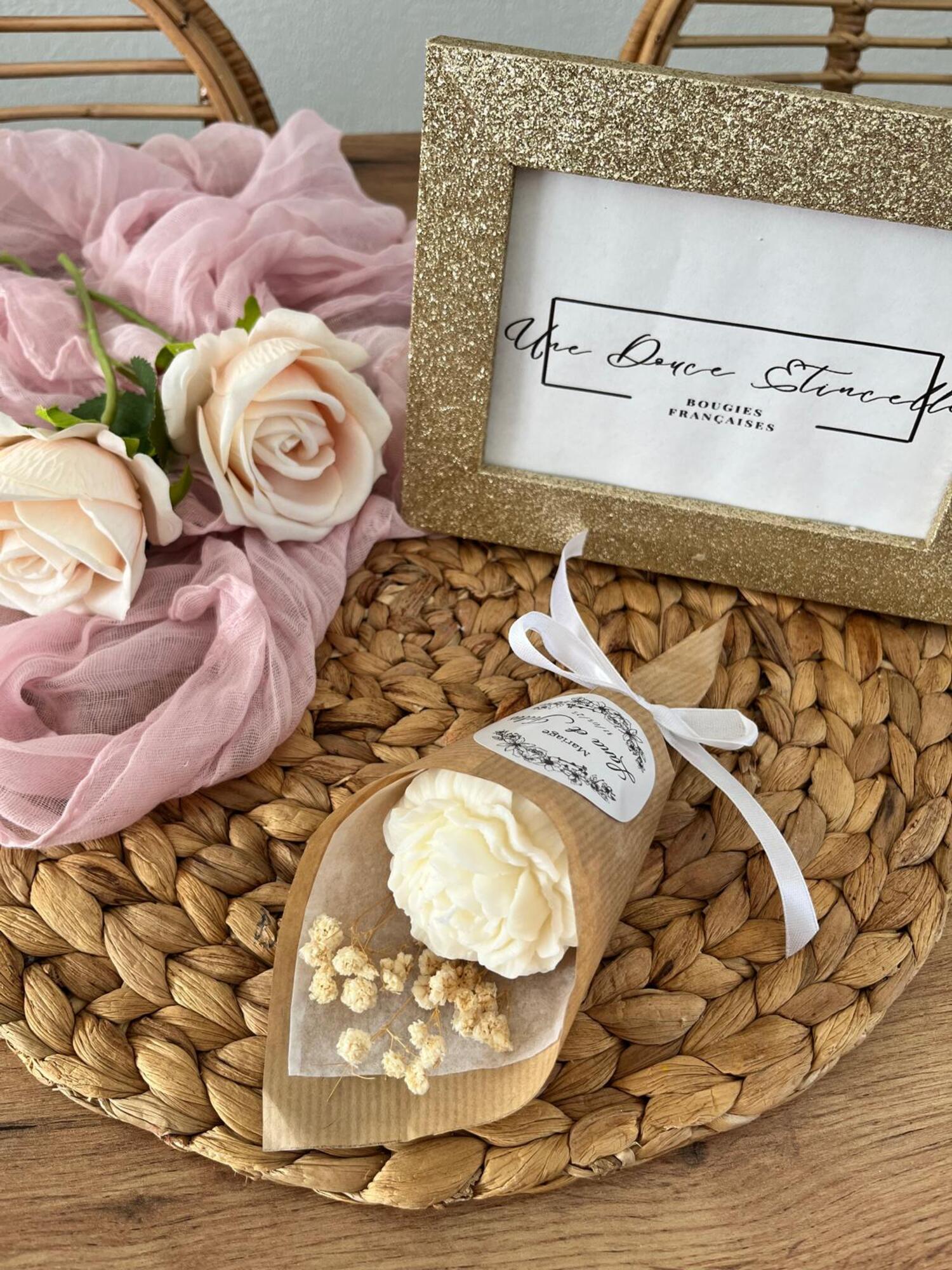 Offrez une bougie fleur élégante en forme de pivoine, décorée de fleurs séchées. Idéal comme cadeau personnalisé pour un anniversaire, un mariage, une communion ou un baptême, elle surprendra vos invités par son originalité.