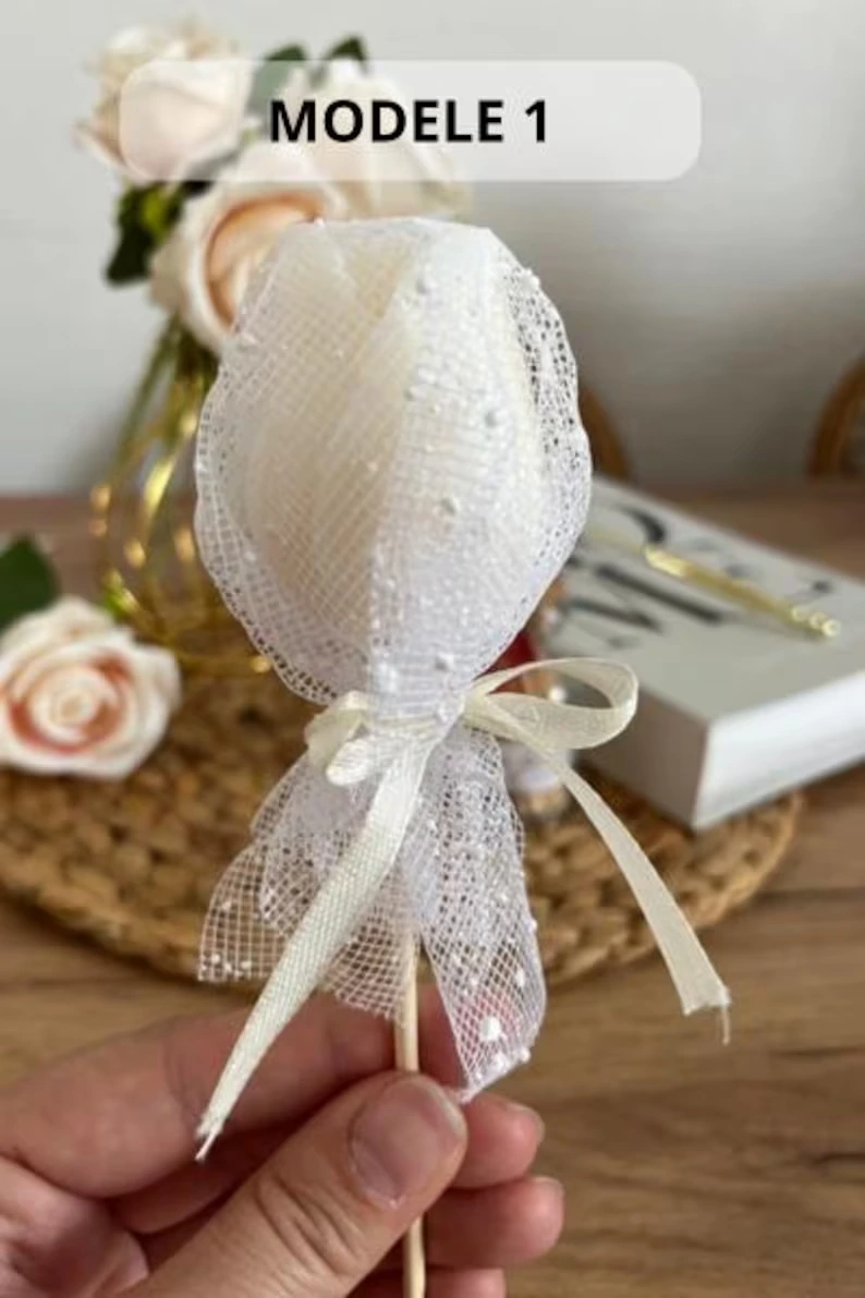 Notre bougie fleur en forme de tulipe accrochée à un bâton et associée à du tulle est un cadeau original et peu coûteux pour offrir à vos invités de mariage ou autre évènement (baptême, anniversaire, communion).