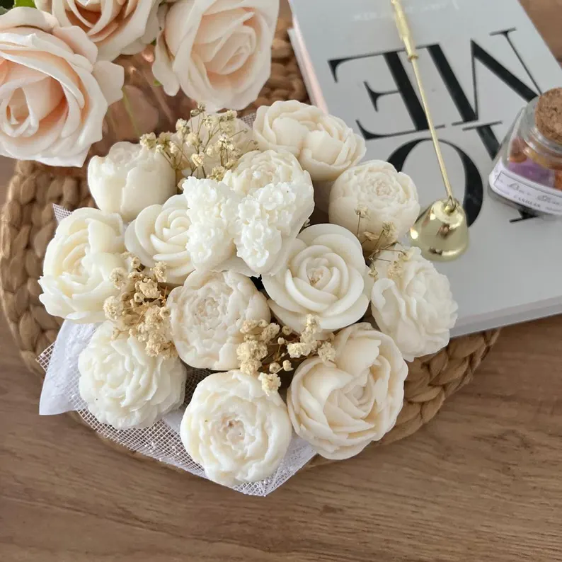 Découvrez notre bouquet de 14 bougies entièrement blanc et fait à la main à partir de cire de soja et de parfums de Grasse. Décoration de table de mariage ou idée cadeau de mariage et anniversaire de mariage